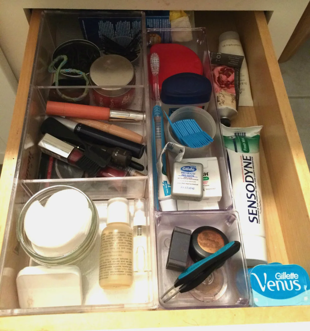 I made my own millimeter adjustments and it's made a huge difference with my morning routine. Before, things would get caught on the drawer liner (which wasn't really doing its job) and the drawer wouldn't close. Shaving cream, epsom salts, lint rollers would topple over whenever I opened the cupboard. Less than 20 minutes later, I switched out some of the containers in the drawer, removed the drawer liner, and rearranged the items. In the cupboard, I moved extra rolls of bath tissue to the hall closet and swapped some containers for the extra flossers, cotton pads, and travel toiletries.
